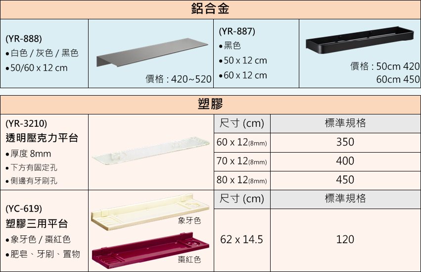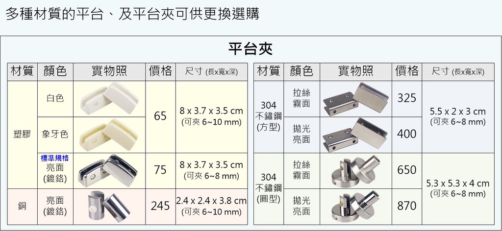平台夾 :__________ (ex: 塑膠鍍鉻 / 方型毛絲面不鏽鋼)